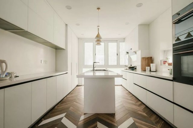 开放式厨房和餐厅之间仅以地板砖的拼接方式和色彩更迭做过渡和划分,纯白的橱柜储物柜配以黑色勾边,整面窗的采光性极佳,黄铜吊灯组合下是一个带双水槽的中岛台,整个厨房的动线流畅,空间布局大气,烹饪区在内里靠窗,远离餐厅,避免油烟烦恼。