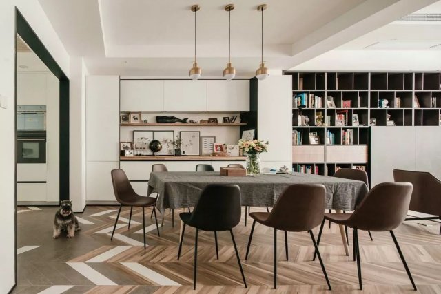 北欧风的餐桌椅组合,黄铜餐厅吊灯,继续延续着客厅配色的简洁和温暖,黑白原木三色的餐边柜则修饰了整个空间大量的白造成的单调。