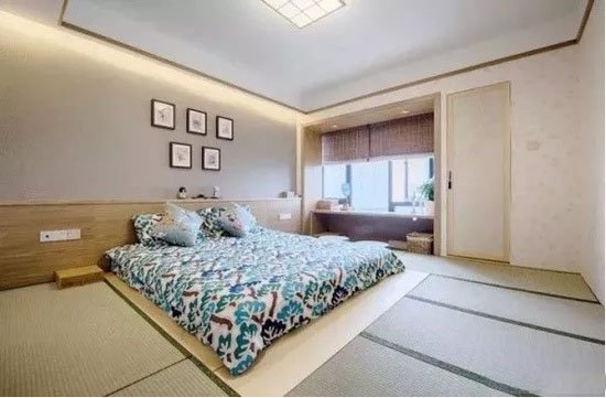 【主卧】主卧室的设计遵循传统日式的特点,选择了榻榻米样式,使得空间中有更多的收纳空间。床头背景墙所贴的墙纸与其他墙面的墙纸不同,床头的墙纸是绿色竹席纹,在灯带的映照下显得比较自然又有禅意。