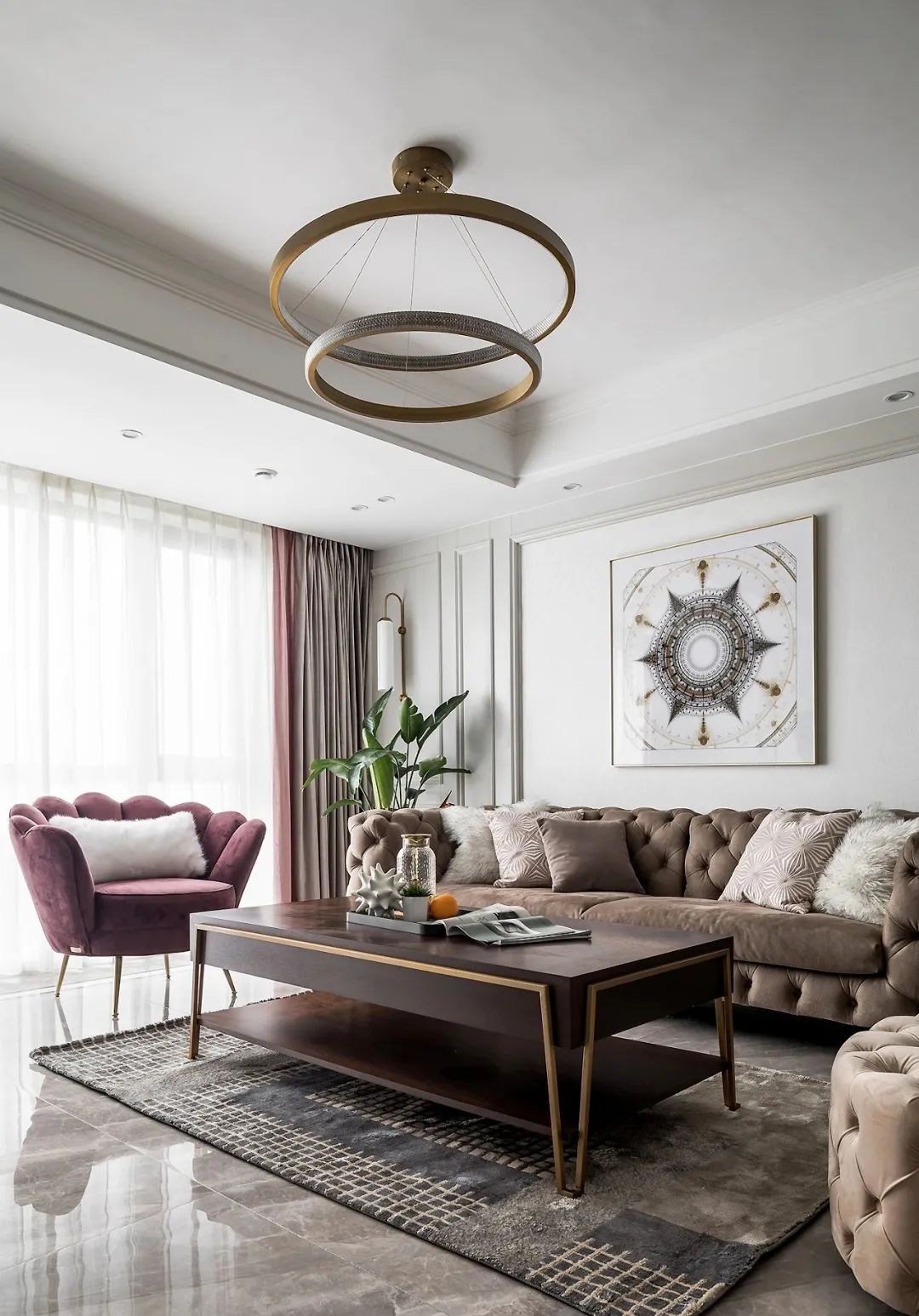 ▲ 设计师选择了浅灰色作为客厅的主色调,融合金属色达到轻奢感,再加入少许亮色与绿植提亮空间。
